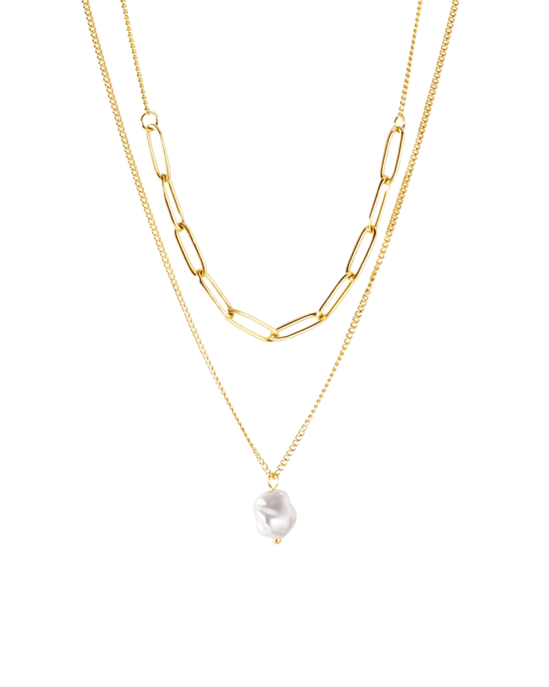 Die Milora Halskette vereint moderne Statement-Elemente mit klassischer Perlen-Eleganz. Das zweireihige Design kombiniert eine markantere Gliederkette mit einer feinen, kürzeren Kette, die von einer barocken Imitationsperle geschmückt wird. So entsteht ein harmonischer Layering-Look, der gleichzeitig kraftvoll und feminin wirkt.