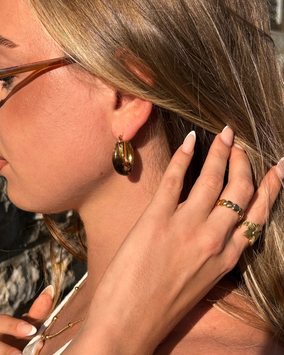 Die Riva Creolen vereinen minimalistisches Design mit einer markanten U-Silhouette. Polierter, 18K PVD-vergoldeter Edelstahl trifft auf edle, weiße Resin-Elemente, ein ruhiger Kontrast, der Looks vom Clean-Chic bis zum Abendoutfit mühelos veredelt.