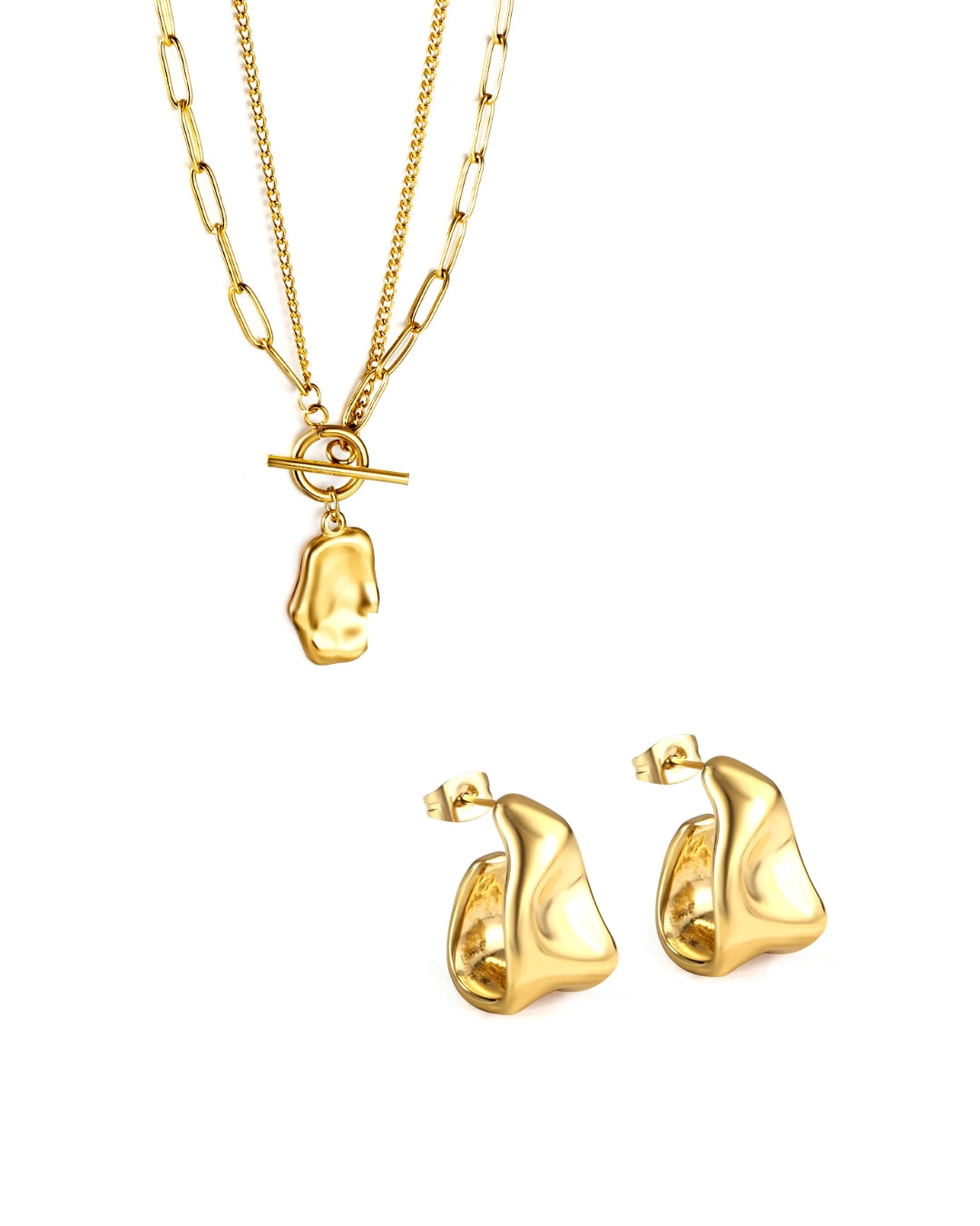 Modern, organisch, mit einem liebevollen Twist: Das Talina & Frida Set verbindet skulpturale Statement-Ohrringe mit einer cleanen Herz-Kette – für einen Look, der gleichzeitig trendbewusst, elegant und vielseitig ist.